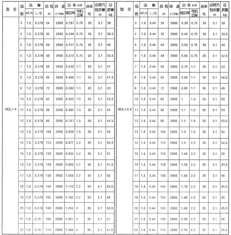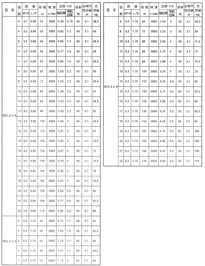 泵型(xíng)號意義:如WDL1.6-8×10。1.6-流量(m/h);8-單級揚程(m);10-級(jí)數。