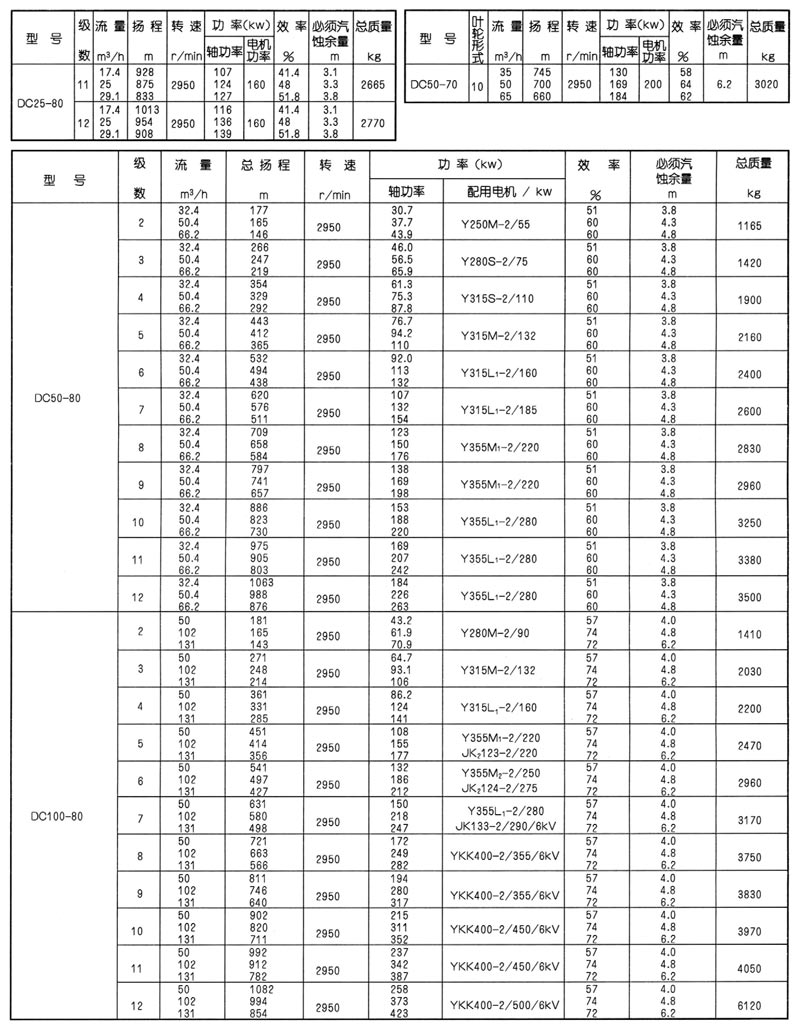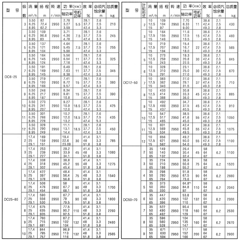 型號中的數字意義:如DC50-80。50--設計點流(liú)量(m'/h),80--單(dān)級揚程(mm)。